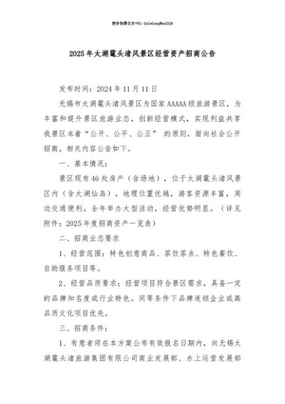 【七哥公文】2025年:【七哥公文】2025年太湖鼋头渚风景区经营资产招商公告+更多免费公文+VX:QiGeGongWen2024+更多免费公文+VX:QiGeGongWen2024