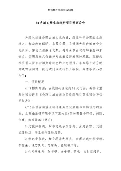 【七哥公文】2025年:【七哥公文】Xx古城文旅业态焕新项目招商公告+更多免费公文+VX:QiGeGongWen2024+更多免费公文+VX:QiGeGongWen2024