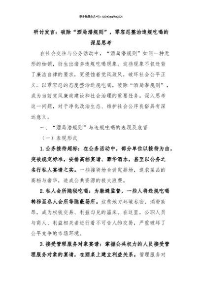 【七哥公文】2025年:【七哥公文】研讨发言:破除“酒局潜规则”,零容忍整治违规吃喝的深层思考+更多免费公文+VX:QiGeGongWen2024+更多免费公文+VX:QiGeGongWen2024