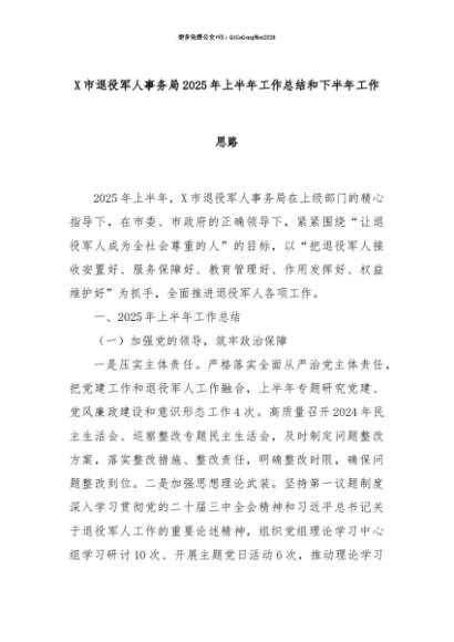 【七哥公文】2025年:【七哥公文】X市退役军人事务局2025年上半年工作总结和下半年工作思路+更多免费公文+VX:QiGeGongWen2024+更多免费公文+VX:QiGeGongWen2024