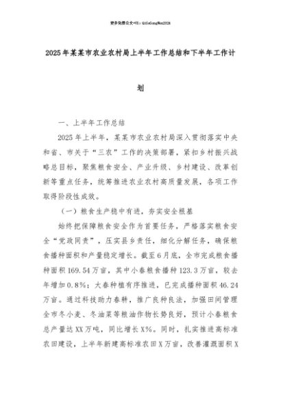 【七哥公文】2025年:【七哥公文】2025年某某市农业农村局上半年工作总结和下半年工作计划+更多免费公文+VX:QiGeGongWen2024+更多免费公文+VX:QiGeGongWen2024
