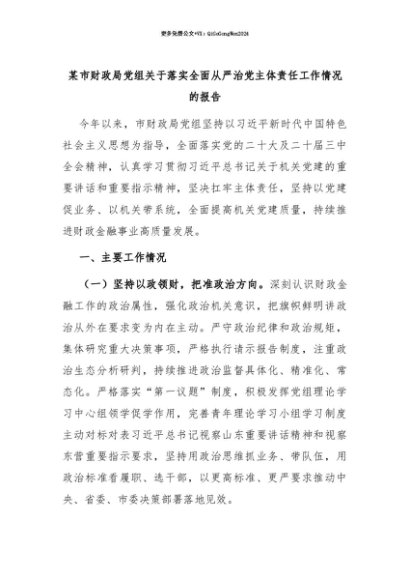【七哥公文】2025年:【七哥公文】某市财政局党组关于落实全面从严治党主体责任工作情况的报告+更多免费公文+VX:QiGeGongWen2024+更多免费公文+VX:QiGeGongWen2024