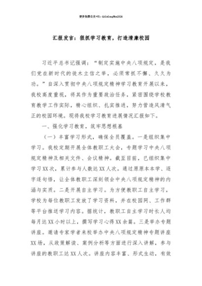 【七哥公文】2025年:【七哥公文】汇报发言:狠抓学习教育,打造清廉校园+更多免费公文+VX:QiGeGongWen2024+更多免费公文+VX:QiGeGongWen2024