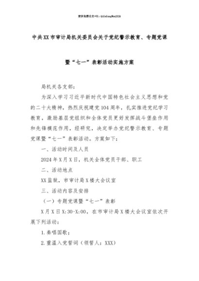 【七哥公文】2025年:【七哥公文】中共XX市审计局机关委员会关于党纪警示教育、专题党课暨“七一”表彰活动实施方案+更多免费公文+VX:QiGeGongWen2024+更多免费公文+VX:QiGeGongWen2024