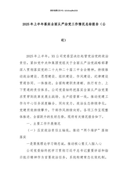 【七哥公文】2025年:【七哥公文】2025年上半年落实全面从严治党工作情况总结报告(公司)+更多免费公文+VX:QiGeGongWen2024+更多免费公文+VX:QiGeGongWen2024