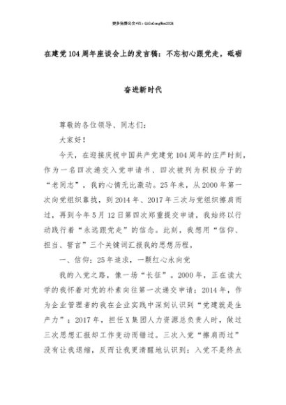 【七哥公文】2025年:【七哥公文】在建党104周年座谈会上的发言稿:不忘初心跟党走,砥砺奋进新时代+更多免费公文+VX:QiGeGongWen2024+更多免费公文+VX:QiGeGongWen2024
