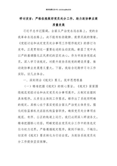 【七哥公文】2025年:【七哥公文】《党组讨论和决定党员处分事项工作程序规定》研讨发言:严格依规做好党员处分工作,助力政协事业高质量发展+更多免费公文+VX:QiGeGongWen2024+更多免费公文+VX:QiGeGongWen2024