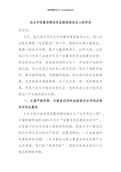 【七哥公文】2025年:【七哥公文】在全市安置房建设攻坚提速推进会上的讲话+更多免费公文+VX:QiGeGongWen2024+更多免费公文+VX:QiGeGongWen2024