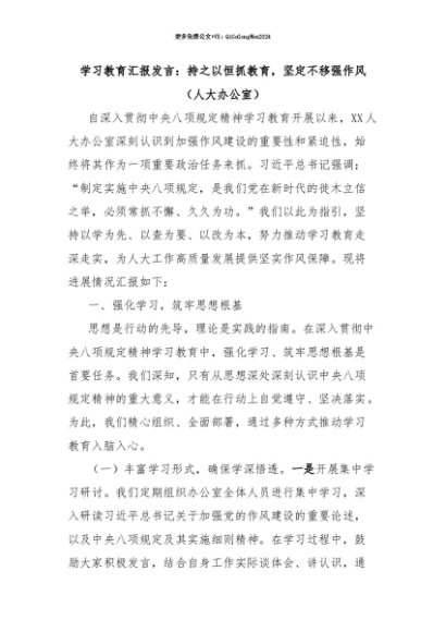 【七哥公文】2025年:【七哥公文】学习教育汇报发言:持之以恒抓教育,坚定不移强作风(人大办公室)+更多免费公文+VX:QiGeGongWen2024+更多免费公文+VX:QiGeGongWen2024