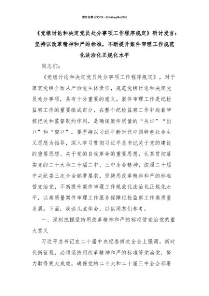 【七哥公文】2025年:【七哥公文】《党组讨论和决定党员处分事项工作程序规定》研讨发言:坚持以改革精神和严的标准,不断提升案件审理工作规范化法治化正规化水平+更多免费公文+VX:QiGeGongWen2024+更多免费公文+VX:QiGeGongWen2024