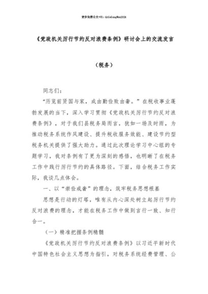 【七哥公文】2025年:【七哥公文】《党政机关厉行节约反对浪费条例》研讨会上的交流发言(税务)+更多免费公文+VX:QiGeGongWen2024+更多免费公文+VX:QiGeGongWen2024