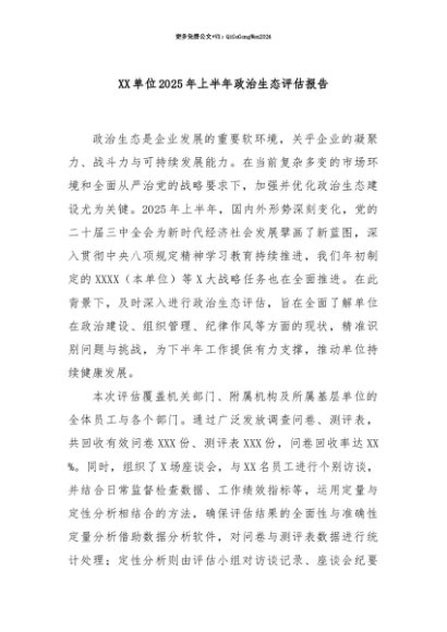 【七哥公文】2025年:【七哥公文】XX单位2025年上半年政治生态评估报告+更多免费公文+VX:QiGeGongWen2024+更多免费公文+VX:QiGeGongWen2024