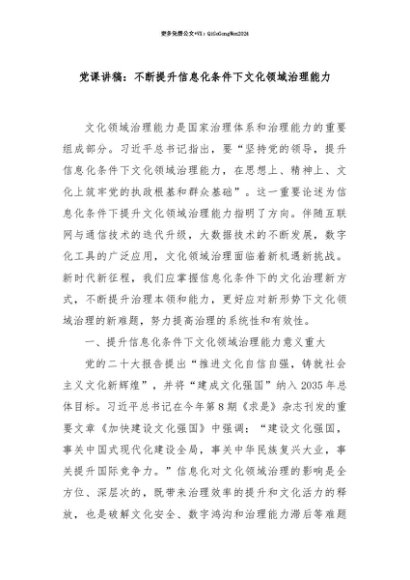 【七哥公文】2025年:【七哥公文】党课讲稿:不断提升信息化条件下文化领域治理能力+更多免费公文+VX:QiGeGongWen2024+更多免费公文+VX:QiGeGongWen2024