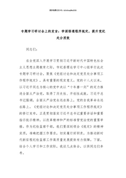 【七哥公文】2025年:【七哥公文】《党组讨论和决定党员处分事项工作程序规定》专题学习研讨会上的发言:学深悟透程序规定,提升党纪处分质效+更多免费公文+VX:QiGeGongWen2024+更多免费公文+VX:QiGeGongWen2024