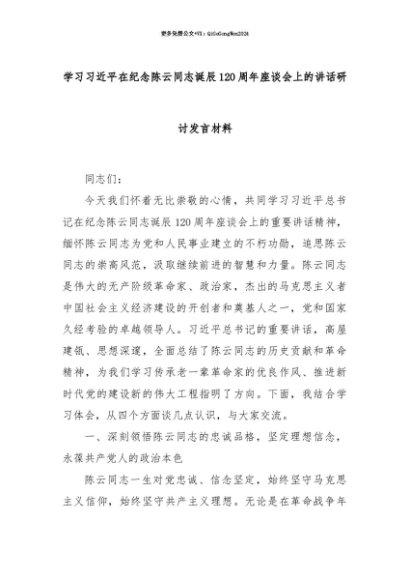 【七哥公文】2025年:【七哥公文】学习习近平在纪念陈云同志诞辰120周年座谈会上的讲话研讨发言材料+更多免费公文+VX:QiGeGongWen2024+更多免费公文+VX:QiGeGongWen2024