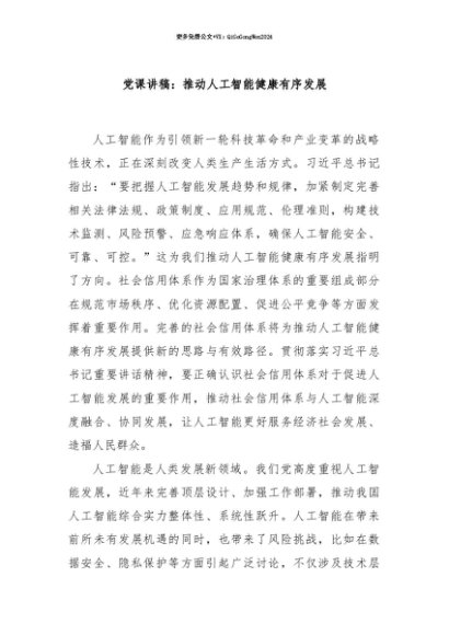【七哥公文】2025年:【七哥公文】党课讲稿:推动人工智能健康有序发展+更多免费公文+VX:QiGeGongWen2024+更多免费公文+VX:QiGeGongWen2024