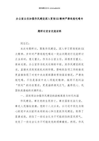 【七哥公文】2025年:【七哥公文】办公室主任加强作风建设深入贯彻XX精神严禁违规吃喝专题研讨发言交流材料+更多免费公文+VX:QiGeGongWen2024+更多免费公文+VX:QiGeGongWen2024