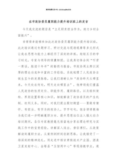 【七哥公文】2025年:【七哥公文】在市政协委员履职能力提升培训班上的发言+更多免费公文+VX:QiGeGongWen2024+更多免费公文+VX:QiGeGongWen2024