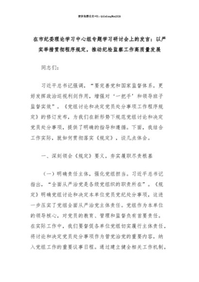 【七哥公文】2025年:【七哥公文】在市纪委理论学习中心组专题学习《党组讨论和决定党员处分事项工作程序规定》研讨会上的发言:以严实举措贯彻程序规定,推动纪检监察工作高质量发展+更多免费公文+VX:QiGeGongWen2024+更多免费公文+VX:QiGeGongWen2024
