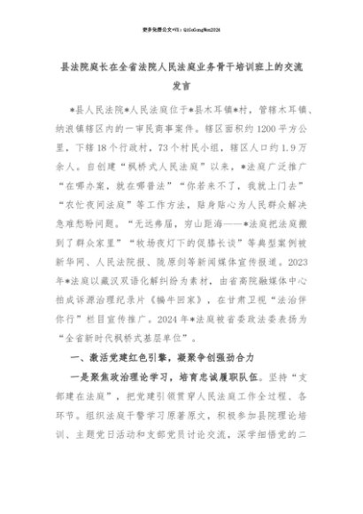 【七哥公文】2025年:【七哥公文】县法院庭长在全省法院人民法庭业务骨干培训班上的交流发言+更多免费公文+VX:QiGeGongWen2024+更多免费公文+VX:QiGeGongWen2024