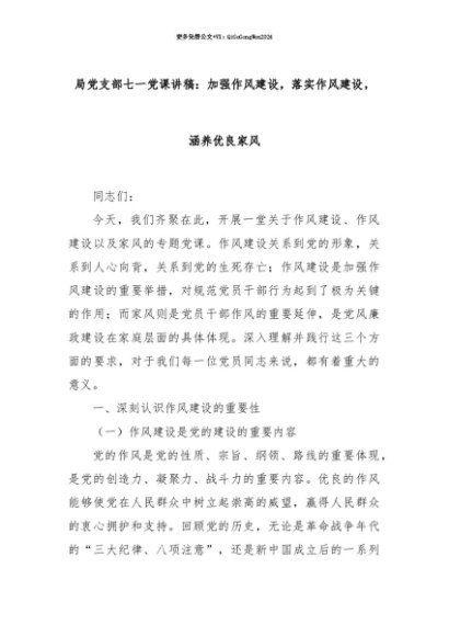 【七哥公文】2025年:【七哥公文】局党支部七一党课讲稿:加强作风建设,落实作风建设,涵养优良家风+更多免费公文+VX:QiGeGongWen2024+更多免费公文+VX:QiGeGongWen2024