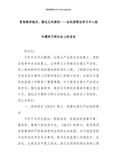 【七哥公文】2025年:【七哥公文】贯彻程序规定,强化正风肃纪——在纪委理论学习中心组专题学习研讨会上的发言+更多免费公文+VX:QiGeGongWen2024+更多免费公文+VX:QiGeGongWen2024