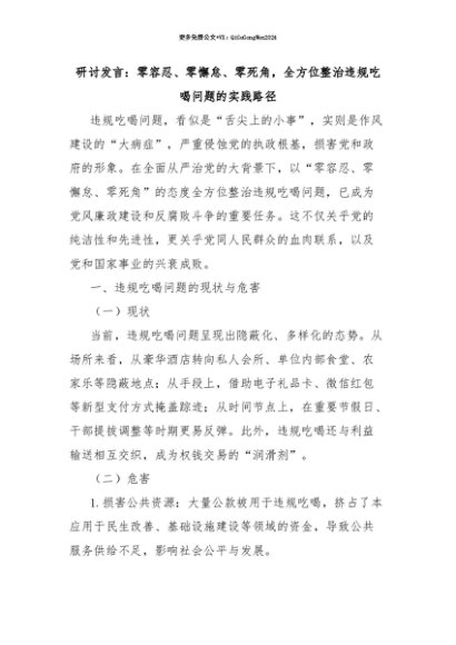 【七哥公文】2025年:【七哥公文】研讨发言:零容忍、零懈怠、零死角,全方位整治违规吃喝问题的实践路径+更多免费公文+VX:QiGeGongWen2024+更多免费公文+VX:QiGeGongWen2024