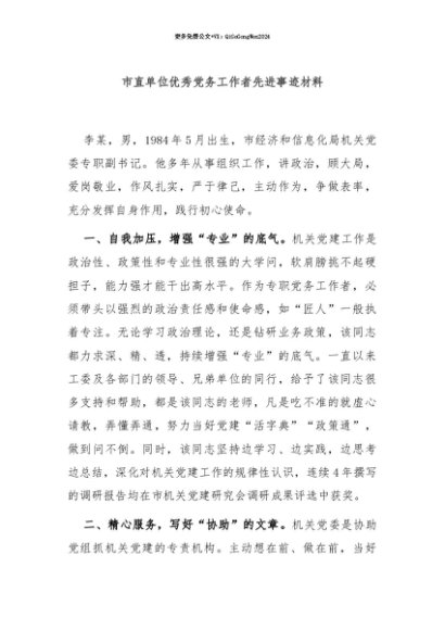 【七哥公文】2025年:【七哥公文】市直单位优秀党务工作者先进事迹材料+更多免费公文+VX:QiGeGongWen2024+更多免费公文+VX:QiGeGongWen2024