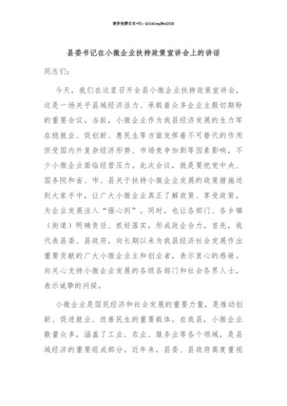 【七哥公文】2025年:【七哥公文】县委书记在小微企业扶持政策宣讲会上的讲话+更多免费公文+VX:QiGeGongWen2024+更多免费公文+VX:QiGeGongWen2024