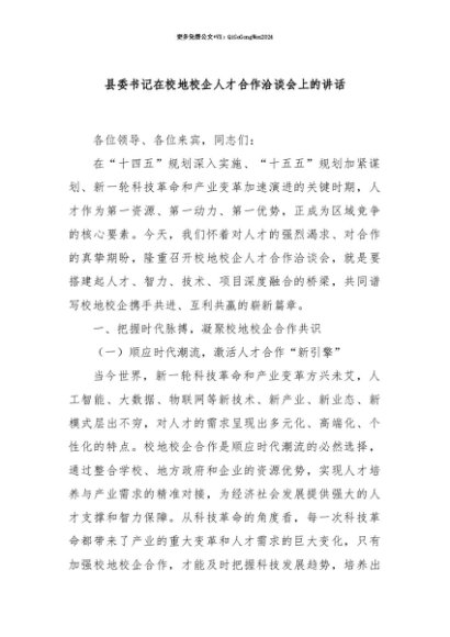 【七哥公文】2025年:【七哥公文】县委书记在校地校企人才合作洽谈会上的讲话+更多免费公文+VX:QiGeGongWen2024+更多免费公文+VX:QiGeGongWen2024