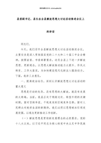 【七哥公文】2025年:【七哥公文】县委副书记、县长在全县解放思想大讨论活动推进会议上的讲话+更多免费公文+VX:QiGeGongWen2024+更多免费公文+VX:QiGeGongWen2024