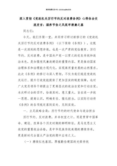 【七哥公文】2025年:【七哥公文】深入贯彻《党政机关厉行节约反对浪费条例》心得体会交流发言:涵养节俭之风筑牢清廉之基+更多免费公文+VX:QiGeGongWen2024+更多免费公文+VX:QiGeGongWen2024