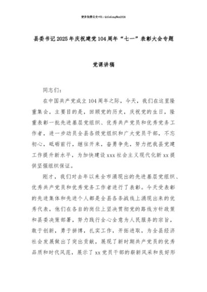 【七哥公文】2025年:【七哥公文】县委书记2025年庆祝建党104周年“七一”表彰大会专题党课讲稿+更多免费公文+VX:QiGeGongWen2024+更多免费公文+VX:QiGeGongWen2024