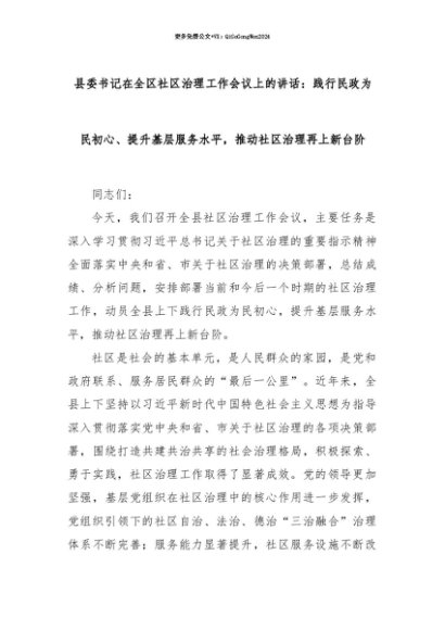 【七哥公文】2025年:【七哥公文】县委书记在全区社区治理工作会议上的讲话:践行民政为民初心、提升基层服务水平,推动社区治理再上新台阶+更多免费公文+VX:QiGeGongWen2024+更多免费公文+VX:QiGeGongWen2024