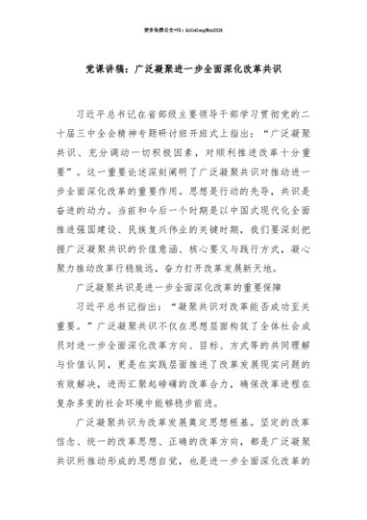 【七哥公文】2025年:【七哥公文】党课讲稿:广泛凝聚进一步全面深化改革共识+更多免费公文+VX:QiGeGongWen2024+更多免费公文+VX:QiGeGongWen2024