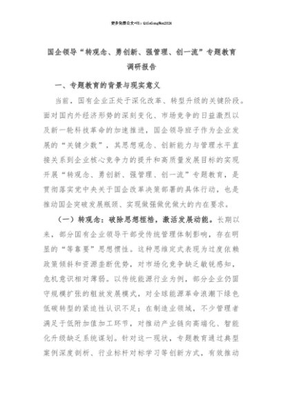 【七哥公文】2025年:【七哥公文】国企领导“转观念、勇创新、强管理、创一流”专题教育调研报告+更多免费公文+VX:QiGeGongWen2024+更多免费公文+VX:QiGeGongWen2024