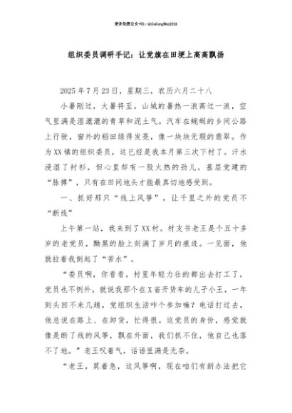 【七哥公文】2025年:【七哥公文】组织委员调研手记:让党旗在田埂上高高飘扬+更多免费公文+VX:QiGeGongWen2024+更多免费公文+VX:QiGeGongWen2024
