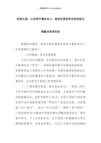 【七哥公文】2025年:【七哥公文】经验汇报:以刮骨疗毒的决心,推动机要保密系统违规吃喝整治取得实效+更多免费公文+VX:QiGeGongWen2024+更多免费公文+VX:QiGeGongWen2024