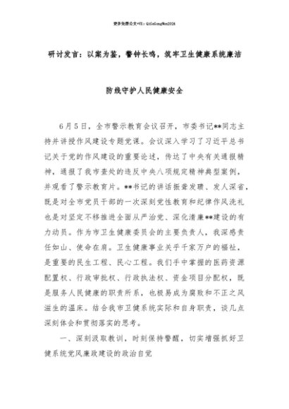 【七哥公文】2025年:【七哥公文】研讨发言:以案为鉴,警钟长鸣,筑牢卫生健康系统廉洁防线守护人民健康安全+更多免费公文+VX:QiGeGongWen2024+更多免费公文+VX:QiGeGongWen2024