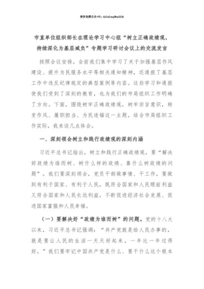 【七哥公文】2025年:【七哥公文】市直单位组织部长在理论学习中心组“树立正确政绩观,持续深化为基层减负”专题学习研讨会议上的交流发言+更多免费公文+VX:QiGeGongWen2024+更多免费公文+VX:QiGeGongWen2024