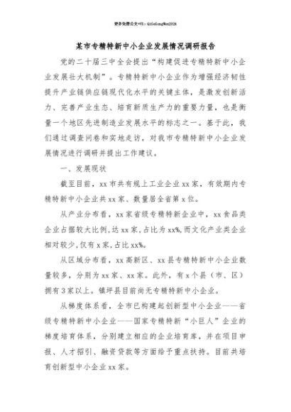 【七哥公文】2025年:【七哥公文】某市专精特新中小企业发展情况调研报告+更多免费公文+VX:QiGeGongWen2024+更多免费公文+VX:QiGeGongWen2024