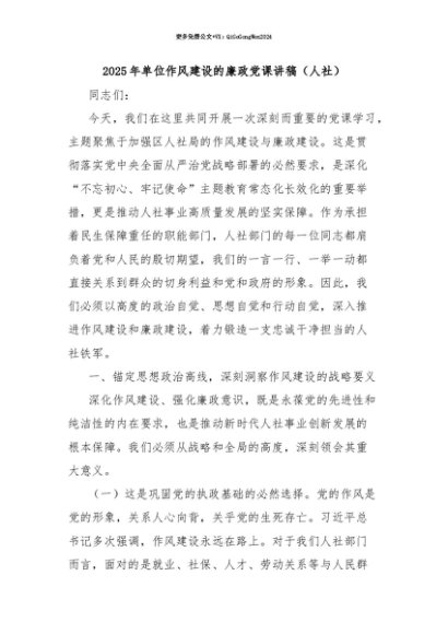 【七哥公文】2025年:【七哥公文】2025年单位作风建设的廉政党课讲稿(人社)+更多免费公文+VX:QiGeGongWen2024+更多免费公文+VX:QiGeGongWen2024