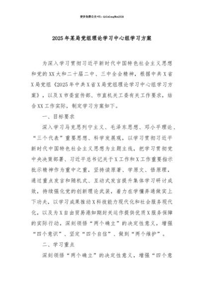 【七哥公文】2025年:【七哥公文】2025年某局党组理论学习中心组学习方案+更多免费公文+VX:QiGeGongWen2024+更多免费公文+VX:QiGeGongWen2024