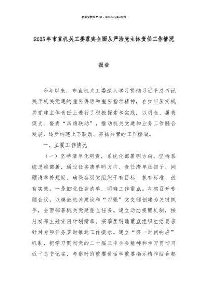 【七哥公文】2025年:【七哥公文】2025年市直机关工委落实全面从严治党主体责任工作情况报告+更多免费公文+VX:QiGeGongWen2024+更多免费公文+VX:QiGeGongWen2024