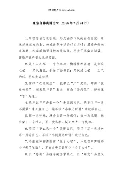 【七哥公文】2025年:【七哥公文】廉洁自律类排比句(2025年7月24日)+更多免费公文+VX:QiGeGongWen2024+更多免费公文+VX:QiGeGongWen2024