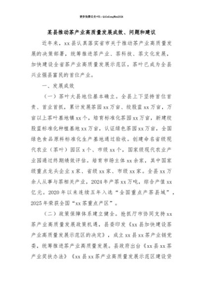 【七哥公文】2025年:【七哥公文】某县推动茶产业高质量发展成效、问题和建议+更多免费公文+VX:QiGeGongWen2024+更多免费公文+VX:QiGeGongWen2024