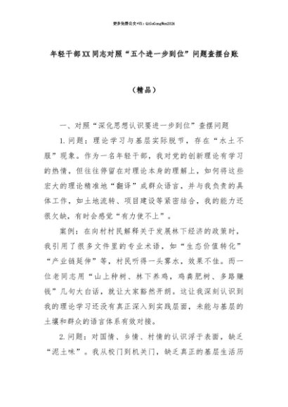 【七哥公文】2025年:【七哥公文】年轻干部XX同志对照“五个进一步到位”问题查摆台账(精品)+更多免费公文+VX:QiGeGongWen2024+更多免费公文+VX:QiGeGongWen2024