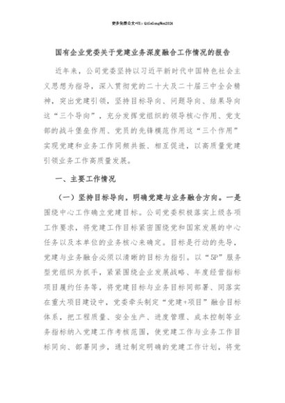 【七哥公文】2025年:【七哥公文】国有企业党委关于党建业务深度融合工作情况的报告+更多免费公文+VX:QiGeGongWen2024+更多免费公文+VX:QiGeGongWen2024