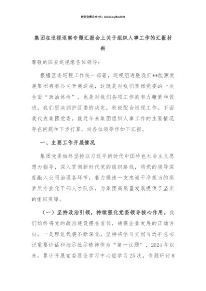 【七哥公文】2025年:【七哥公文】集团在巡视巡察专题汇报会上关于组织人事工作的汇报材料+更多免费公文+VX:QiGeGongWen2024+更多免费公文+VX:QiGeGongWen2024