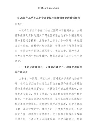 【七哥公文】2025年:【七哥公文】在2025年三季度工作会议暨经济运行调度会的讲话提纲+更多免费公文+VX:QiGeGongWen2024+更多免费公文+VX:QiGeGongWen2024